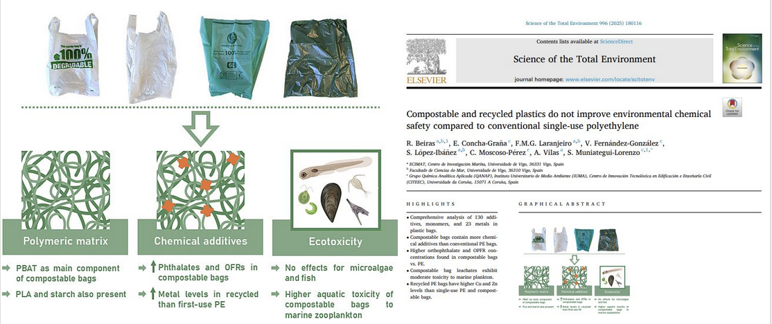 💡 Faut-il considérer les sacs compostables PBAT/PLA/amidon comme une avancée chimique ou écotoxicologique face au polyéthylène (PE) traditionnel ? Les données s’accumulent et remettent profondément en question les compositions chimiques actuellement utilisées dans les plastiques biodégradables. La récente étude de Beiras et al. (2025) a apporté de nouveaux résultats rigoureux. Les auteurs ont quantifier 130 composés chimiques associés aux plastiques (monomers, additifs, NIAS, produits de dégradations) et 23 métaux dans différents sacs plastiques. Résultat : les sacs compostables intègrent une charge chimique supérieure, incluant orthophtalates et retardateurs de flamme organophosphorés, dont certains sont particulièrement préoccupants pour la toxicité aquatique ou le potentiel de perturbation endocrinienne. Autre point intéressant le sac en PE recyclé testé contient plus de composés organiques et également plus de zinc et de cuivre que le sac en PE non recyclé. Les essais écotoxicologiques révèlent une toxicité aiguë significativement plus élevée des lixiviats de sacs compostables, mais seulement sur les invertébrés zooplanctoniques, puisque aucun effet n’a été observé sur les microalgues et poissons aux concentrations testées. Même si, dans ce cas précis, une exposition aiguë n’a pas entraîné de risque majeur pour le milieu marin notamment au niveau du zooplankton, d’autres études ont souligné que des expositions chroniques aux produits de dégradation des plastiques, même à faibles concentrations, pourraient avoir un impact significatif sur les populations de zooplancton et entrainer des effets écologique en cascade (Richon et al., 2024; Langenfeld et al. 2024; Shore et al., 2021). Oui, la compostabilité des matériaux PBAT/PLA/amidon ouvre effectivement la voie à une optimisation de la gestion de fin de vie des plastiques. Toutefois, cette avancée ne peut être considérée comme bénéfique que sous réserve de la vérification de quatre critères essentiels : 1- Les micro- et nanoplastiques générés doivent être rapidement minéralisés dans le compost et/ou l’environnement naturel, une condition qui à ce jour n’a pas encore été démontrée de façon rigoureuse. 2- Les composés chimiques relâchés doivent être non persistants, non mobiles et non bioaccumulables. 3- Les filières locales de tri, de collecte et de compostage doivent être prêtes, transparentes et efficaces. 4- Les objets produits avec ces matériaux doivent être véritablement indispensables aux sociétés, et aucune alternative socialement, énergétiquement et écologiquement viable ne doit exister. En l’absence de la réunion de ces quatre conditions, aucune amélioration tangible du risque chimique et écotoxicologue ne peut être affirmée. De plus rappelons qu'en grande majorité les plastiques biodégradables ne solutionnent pas la pollution plastique dans l'environnement puisque leur biodégradation ne se vérifie que dans certaines conditions de compostage. Beiras, R., Concha-Graña, E., Laranjeiro, F. M. G., Fernández-González, V., López-Ibáñez, S., Moscoso-Pérez, C., Vilas, A., & Muniategui-Lorenzo, S. 2025. “Compostable and Recycled Plastics Do Not Improve Environmental Chemical Safety Compared to Conventional Single-Use Polyethylene.” Science of The Total Environment 996:180116. https://doi.org/10.1016/j.scitotenv.2025.180116. Richon, C., Gorgues, T., Cole, M., Paul-Pont, I., Maes, C., Tagliabue, A., & Laufkötter, C. 2024. “Model Exploration of Microplastic Effects on Zooplankton Grazing Reveal Potential Impacts on the Global Carbon Cycle.” Environmental Research Letters 19(7):074031. https://doi.org/10.1088/1748-9326/ad5195.